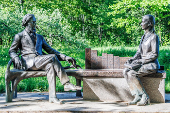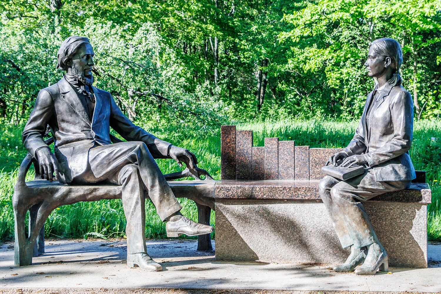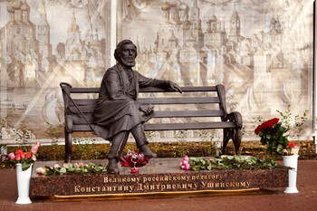 В Москве памятник Константину Дмитриевичу Ушинскому открыт сравнительно недавно - 19 февраля 2023 года. Открытие было приурочено к 200-летию со дня рождения педагога и Году педагога и наставника в России . Находится во внутреннем дворе Московского педагогического государственного университета (МПГУ). Адрес: г. Москва, улица Малая Пироговская, дом 1, строение 6 . Над монументом работал творческий коллектив. Главным художником проекта выступил Юрий Подисов. В создании памятника была задействована группа из 11 скульпторов, художников-проектировщиков и архитекторов . Это бронзовая скульптурная композиция. Константин Ушинский изображен сидящим в кресле. Рядом с ним находится изящный столик, на котором лежит книга. Как пояснил художник проекта, жест педагога символизирует передачу знаний, а книга на столике - это символ «передачи от буквы, от слова через риторику, через словесный контент в сознание» . Памятник был отлит в Смоленске . Памятник К.Д. Ушинскому в Ярославле появился тоже недавно. Он расположен он в сквере у одного из старинных зданий Ярославского государственного педагогического университета им. К.Д. Ушинского. Дата открытия: 9 октября 2023 года. Церемония была приурочена к 200-летию со дня рождения Ушинского. Скульптор: Е.В. Пасхина. Архитекторы: Д. Брандуков и Ю. Козлов. Бронзовая скульптура, установленная на гранитный постамент, изображает сидящего на скамье педагога. Ушинский сидит, опираясь рукой о её спинку, и смотрит вдаль. Памятник К.Д. Ушинскому под названием «Связь поколений. Ленинградский учитель» установлен в 2023 году в городе Гатчина Ленинградской области, в Приоратском парке. Место для памятника выбрано не случайно: недалеко от него находится здание бывшего Сиротского института, где Ушинский начинал свой путь. Сегодня здесь располагается гимназия, носящая его имя. Памятник представляет собой две бронзовые фигуры - Ушинского и молодой учительницы, сидящих друг напротив друга на скамье и общающихся между собой. Ушинский изображён сидящим со свободным изяществом, его рука лежит на спинке элегантной бронзовой скамьи, которая переходит в скамью уже современную, выполненную из камня. На скамье, обращённая к педагогу, сидит молодая учительница. На коленях учительницы - книга и учительская указка, указывающие на преемственность поколений. На отвороте жакета учительницы - брошь в виде пеликана - символа, олицетворяющего глубокие традиции отечественной педагогики. В спинке каменной скамьи заключены 11 ступеней - как 11 классов современного образования, ведущих вверх. Открытие памятника состоялось 6 октября 2023 года в честь Дня учителя. | |