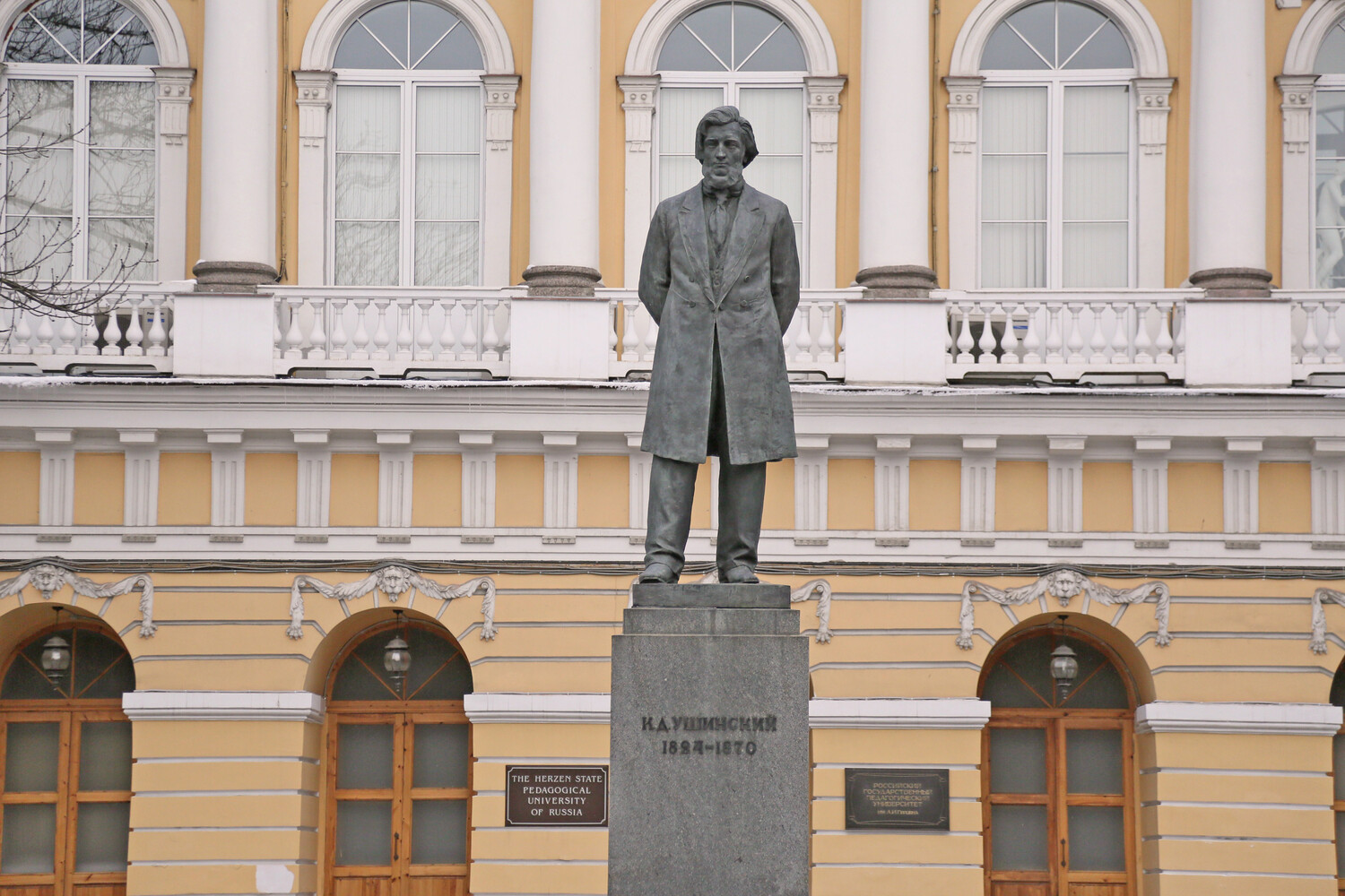 Константин Дмитриевич Ушинский - основоположник научной педагогики в России. Возникает вопрос: увековечена ли память об этом великом человеке в монументах? Известный памятник К.Д. Ушинскому есть в Санкт-Петербурге. Находится перед главным зданием РГПУ им. А.И. Герцена. Адрес: г. Санкт-Петербург, Набережная реки Мойки, 48. Скульптор: В.В. Лишев. Архитектор: В.И. Яковлев. Бронзовая фигура в полный рост на гранитном постаменте. Высота скульптуры 3,5 м, постамента - 4 м . Установку памятника К.Д. Ушинскому планировали в Санкт-Петербурге еще до Октябрьской революции. Так, в 1914 г. был объявлен сбор средств на сооружение памятника и конкурс проектов будущего монумента, победу в котором одержал Н.Л. Аронсон. Однако, изготовление памятника пришлось отложить. В 1945 г. СНК СССР было принято решение об установке памятника в Ленинграде (в связи с 75-летием со дня смерти). Памятник был открыт перед зданием ЛГПИ им. Герцена 30 июня 1961 г.